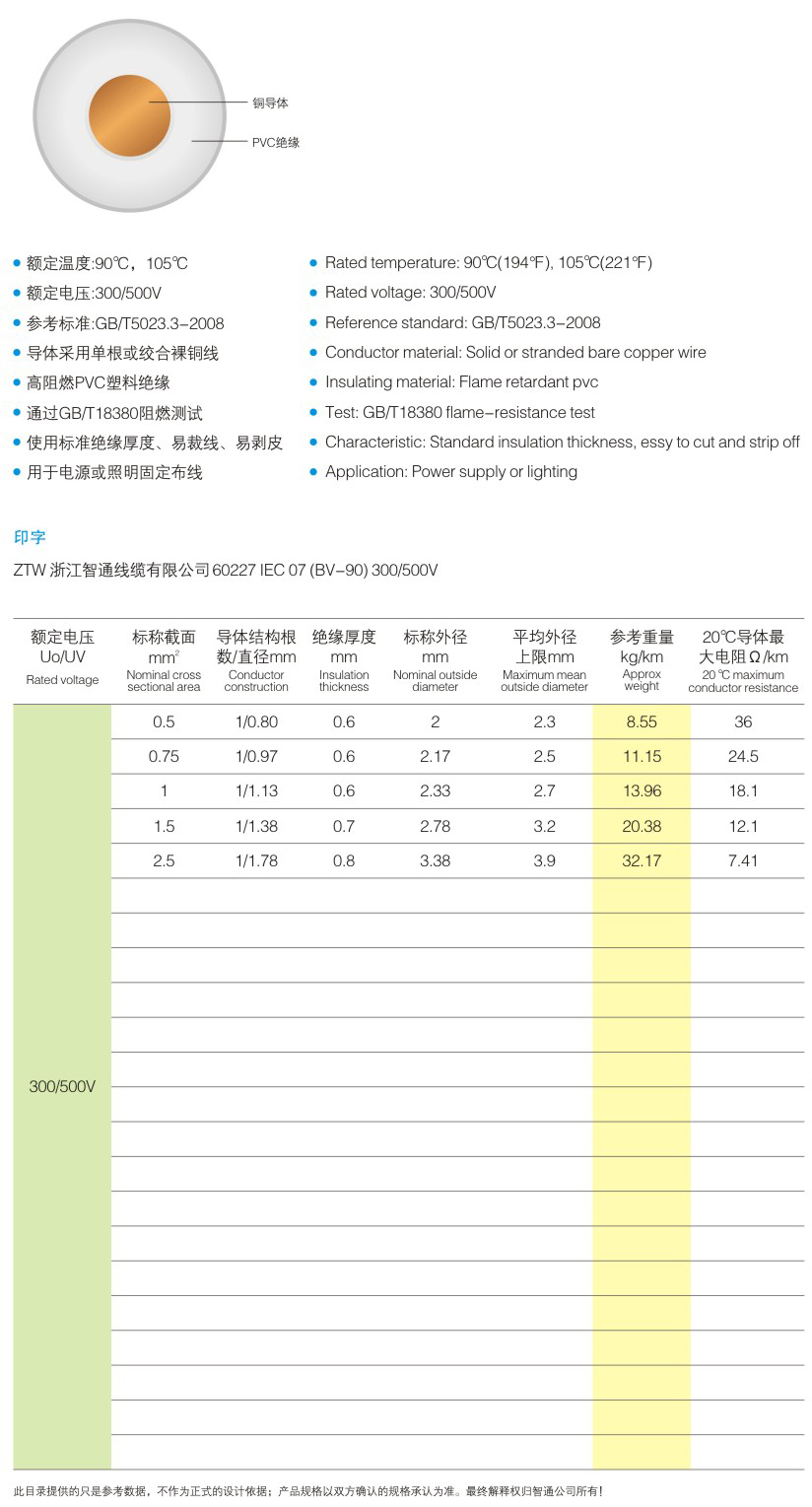 IEC07(BV-90)内部布线用导体温度为90°的单芯铜导体无护套电缆