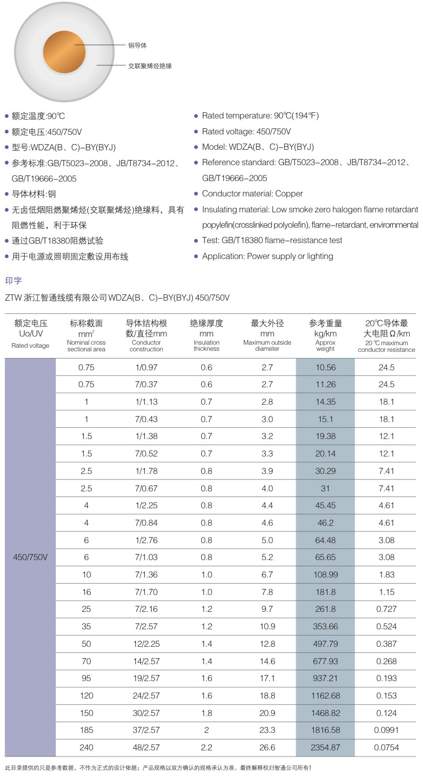 WDZA(B、C)-BY(BYJ)铜芯无卤低烟阻燃聚氯烯烃(交联聚烯烃)绝缘电缆