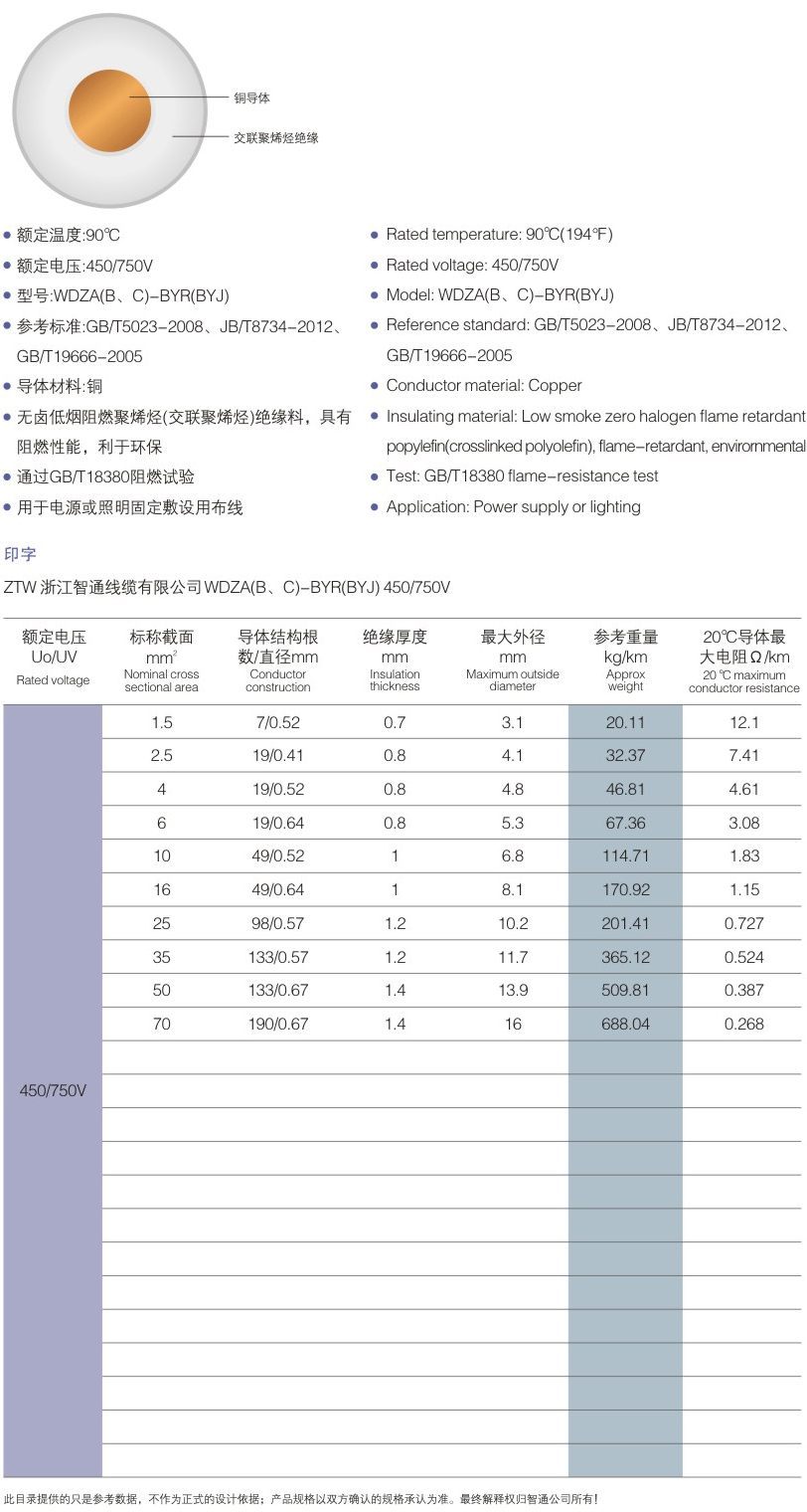 WDZA(B、C)-BYR(BYJ)铜芯无卤低烟阻烯烯烃(交联聚烯烃)绝缘电缆